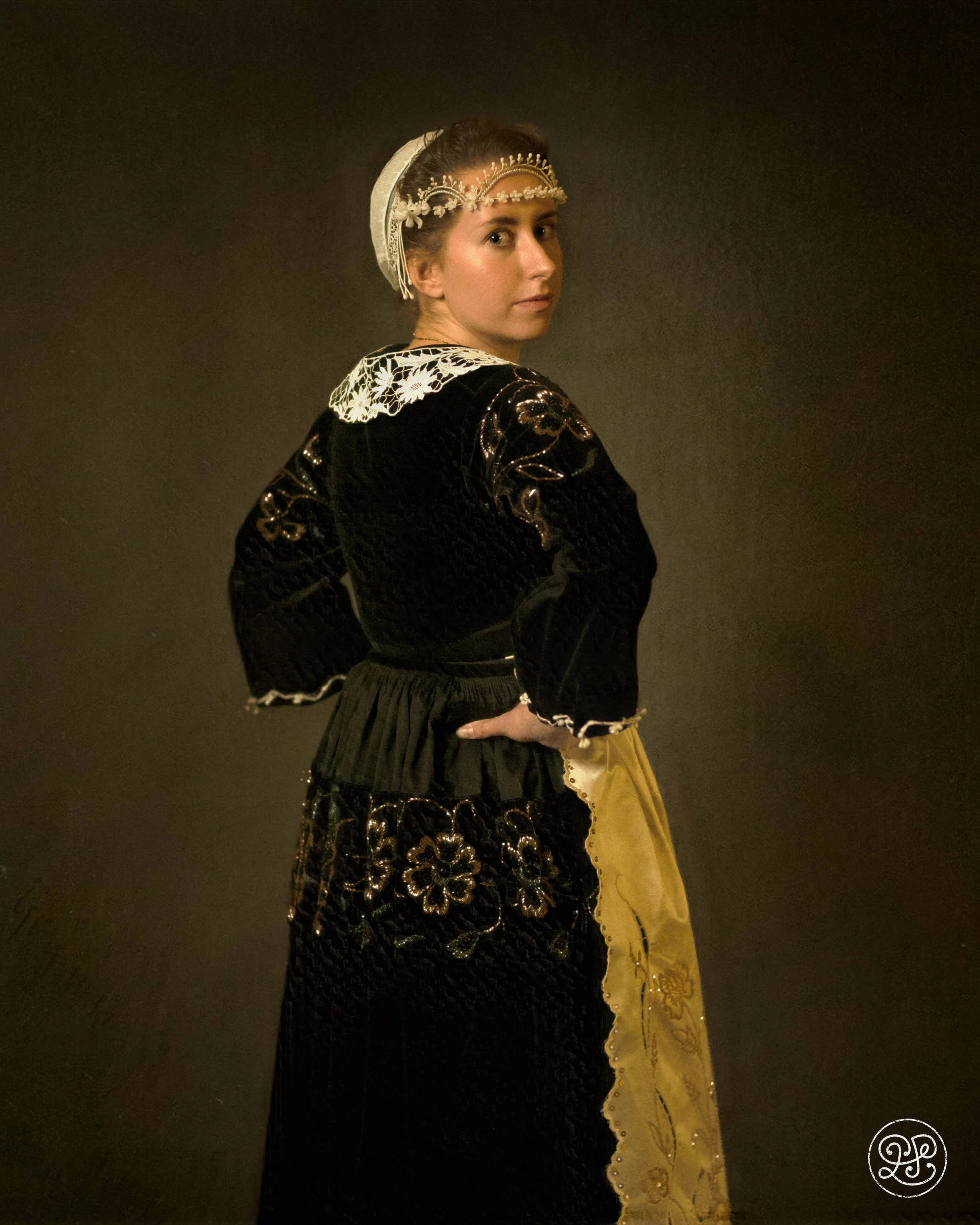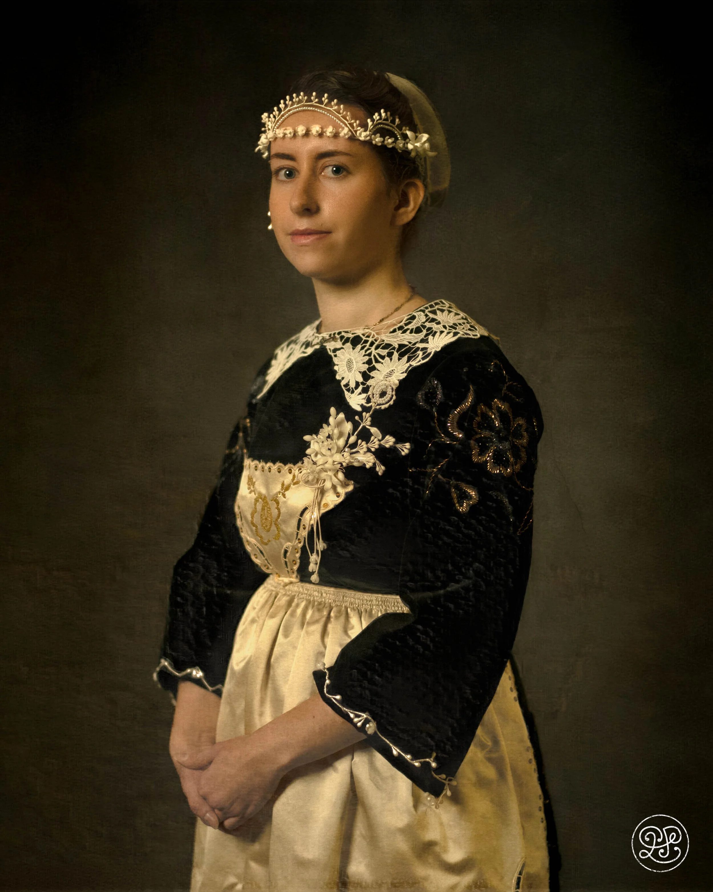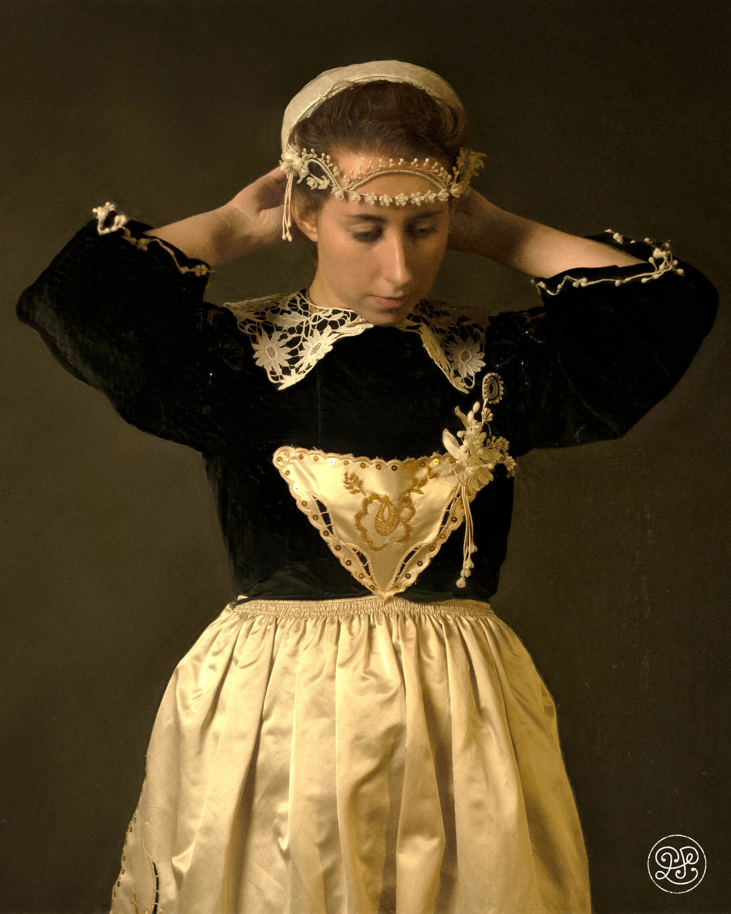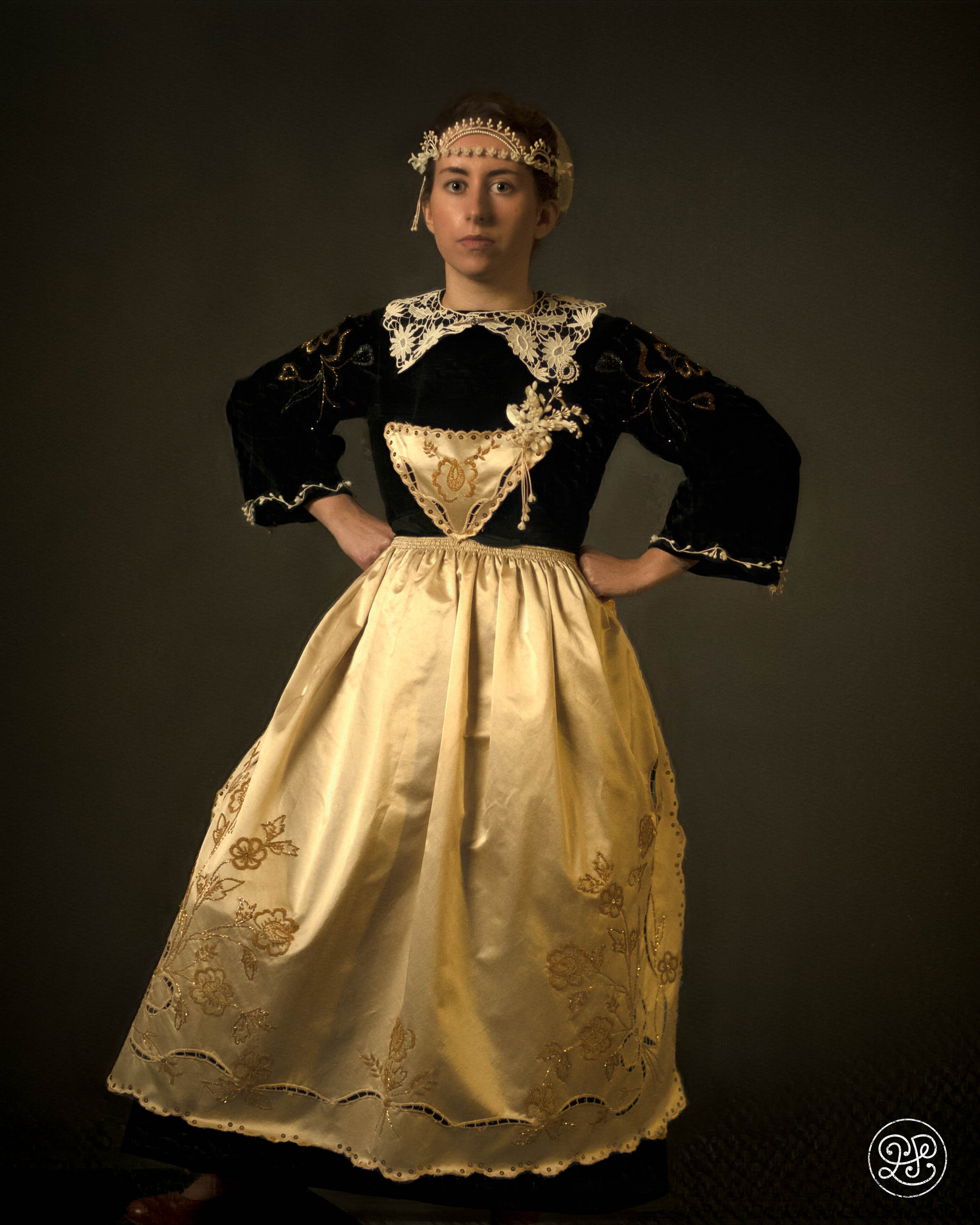 Le costume est majoritairement reconstitué. Les seules pièces d’origine sont la coiffe en tulle brodé, retrouvée dans le grenier de sa grand-mère et issue du fonds familial, ainsi qu’un col en tulle brodé provenant de la collection de Mari-Anna S.